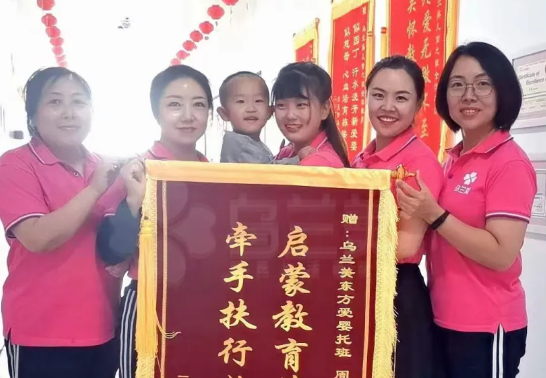 近期,烏蘭美早教中心托班王浩然小朋友的媽媽?zhuān)瑸楸磉_(dá)烏蘭美早教中心老師們對(duì)孩子的辛勤教育和悉心照料的感激之情,將印有“啟蒙教育第一師,牽手扶行始登峰”的錦旗送到老師手中,感謝托班的周靜老師及全體老師們,更加感謝烏蘭早教中心擁有如此出色的師資隊(duì)伍。
